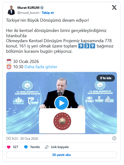 Bakan Kurum, söz konusu duyuruyu sosyal medya hesabı üzerinden yaptı. Açıklamasında, Türkiye genelinde sürdürülen dönüşüm projelerine de değinen Kurum, İstanbul’un bu çalışmaların merkezinde yer aldığını vurguladı.